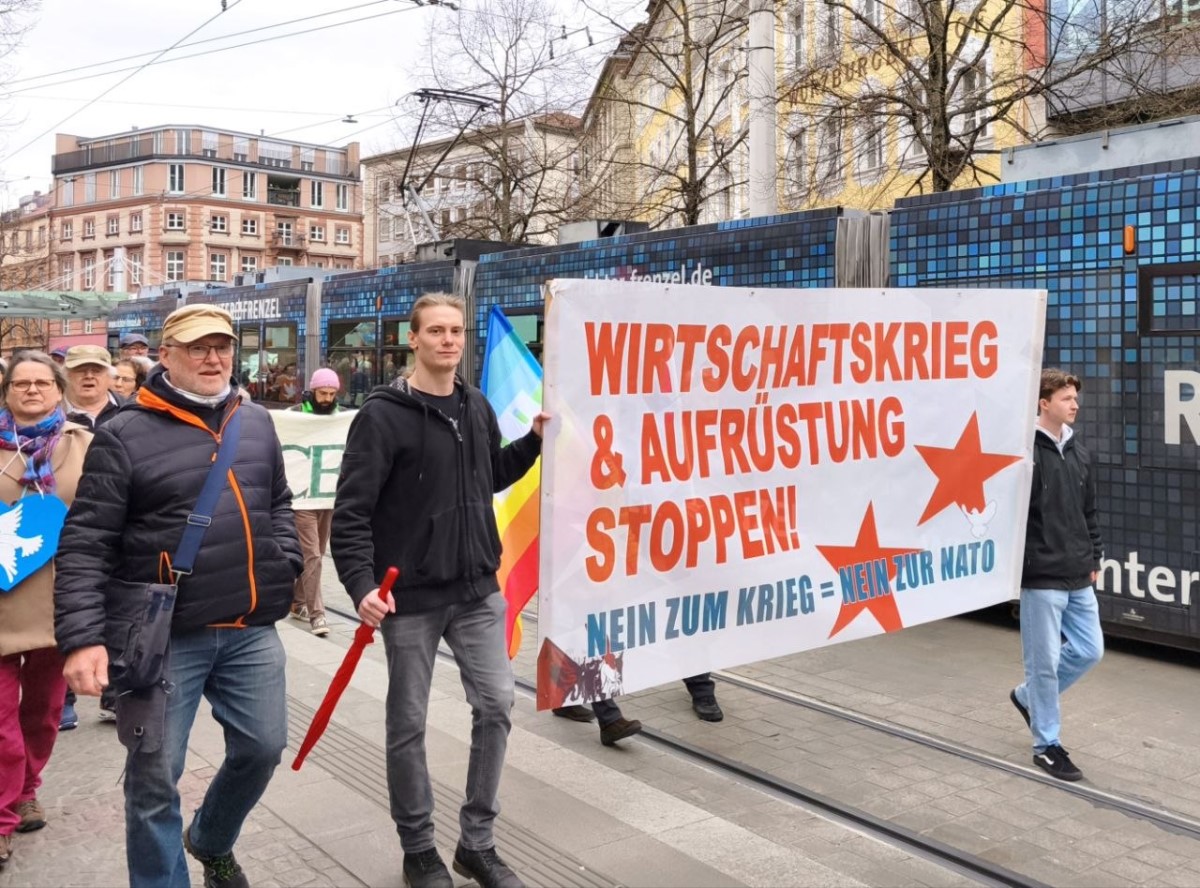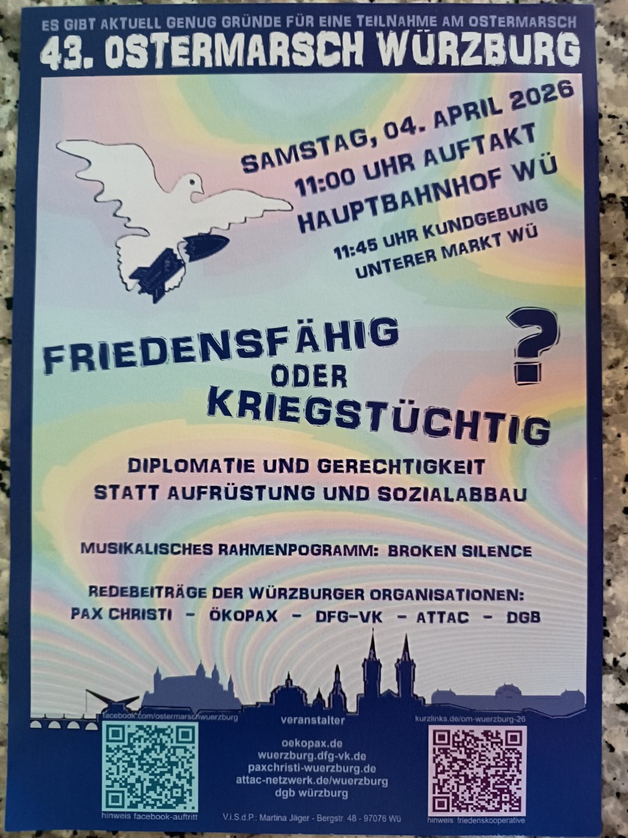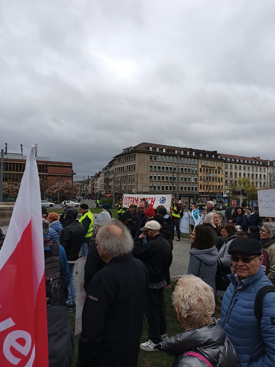 In Würzburg fand am 4. April der diesjährige Ostermarsch statt. Anlässe dafür gibt es mehr als genug. Man müsste in der momentanen Zeit eher nach Gründen suchen, nicht an den Märschen teilzunehmen.