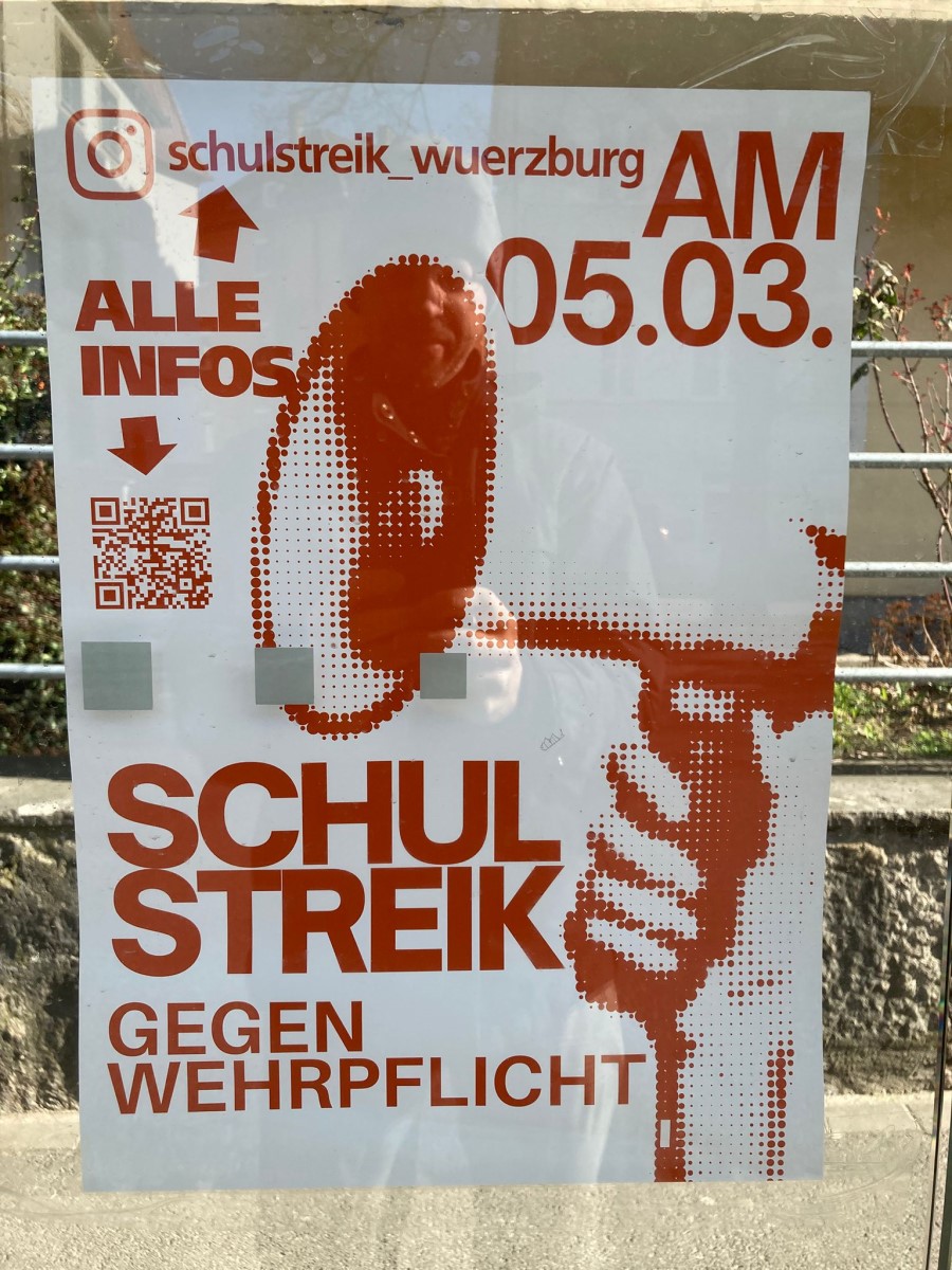 Auffällig ist allerdings, dass und in welchem Maße hier mit zweierlei Maß gemessen wird: Bei Fridays for Future und den Schulstreiks zum Klimaschutz wurden von den eher konservativen Teilen der herrschenden Klasse mit enger Verbindung etwa zur Autoindustrie sowie deren Sprechpuppen zwar dämonisiert, stieß jedoch auf auffällige Sympathie bei den linksliberalen Teilen der herrschenden Klasse, die ihr Geld mit Klimaschutz machen (bzw. dem, was sie dafür halten). Diese Schulstreiks gegen die Wehrpflicht, bei denen es nicht minder um die Zukunft der Jugend geht, werden hingegen einhellig skandalisiert, teilnahmewilligen Schülern waren teils Verweise angedroht worden, die die Teilnehmer oftmals auch bekommen haben. Gerade das hat dazu geführt, dass in Schweinfurt selbt erst gar keine Kundgebung realisiert werden konnte.